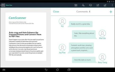 CamScanner là một trong những ứng dụng đọc PDF mạnh mẽ nhất. CamScanner có thể nhập các file PDF từ bộ nhớ thiết bị, nhưng bạn cũng có thể dùng camera điện thoại để chụp tài liệu và lưu nó vào máy như một file PDF. Điều này cực kỳ hữu ích khi bạn cần gửi qua email một văn bản. Sau khi tài liệu được chụp, bạn có thể chèn thêm chú thích. Nó cũng có nhiều tính năng để giúp cải thiện quá trình quét làm cho tài liệu sạch sẽ, sắc nét hơn. CamScanner là ứng dụng quét và chia sẻ số 1 thế giới với hơn 100 triệu lượt cài đặt và có mặt tại hơn 200 quốc gia trên toàn thế giới.