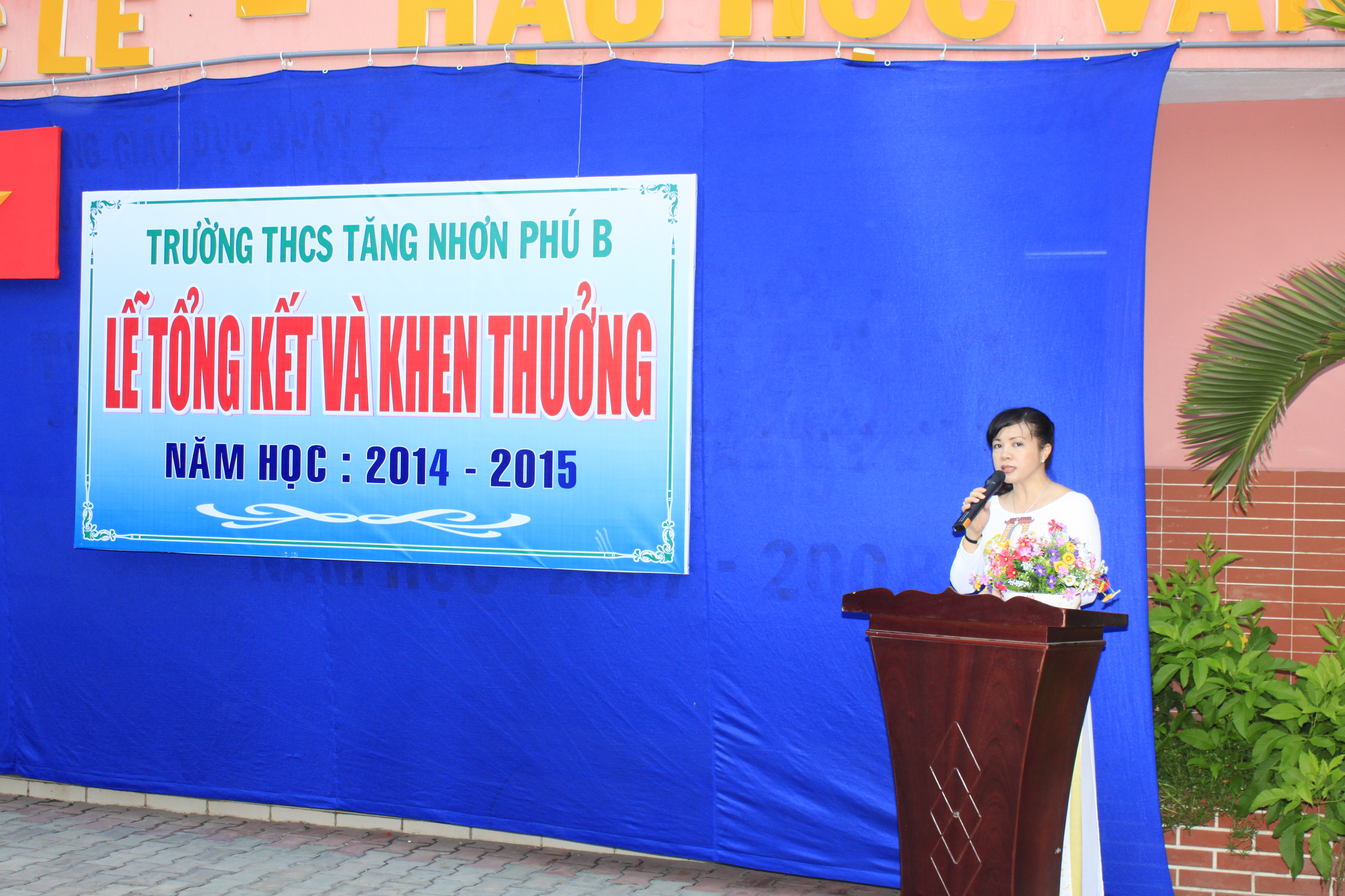 Ngày 20 tháng 5 năm 2015 vừa qua, Lễ Tổng kết năm học 2014 - 2015 đã được long trọng tổ chức tại Trường THCS Tăng Nhơn Phú B. Tham dự buổi Lễ Tổng kết, về phía đại diện Lãnh đạo Phòng GD có Cô Nguyễn Ngọc Loan - Phó HT trường Bổi dưỡng GD Quận 9, nguyên Hiệu Trưởng Trường THCS Tăng Nhơn Phú B. Ngoài ra còn có đại diện của Ban Đại diện Cha mẹ học sinh cùng toàn thể cán bộ, giáo viên, công nhân viên và học sinh Nhà trường đã tham dự buổi Lễ. Sau đây là một số hình ảnh về buổi Lễ này.
